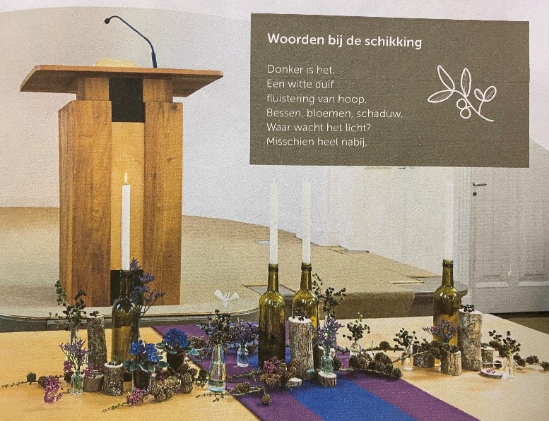 Vier kandelaars met witte kaarsen staan opgesteld. Tussen de eerste en tweede kandelaar zweeft een enkel duifje. Op de boomstammetjes en in de flesjes donkere materialen: paarse bessen, bloeiende heide, kaapsviooltje, dennenappels van de lariks. Paars is de kleur die ons tot inkeer roept. De donkere bessen en bloemen benadrukken het donker van de adventstijd. Eén kaars brandt.